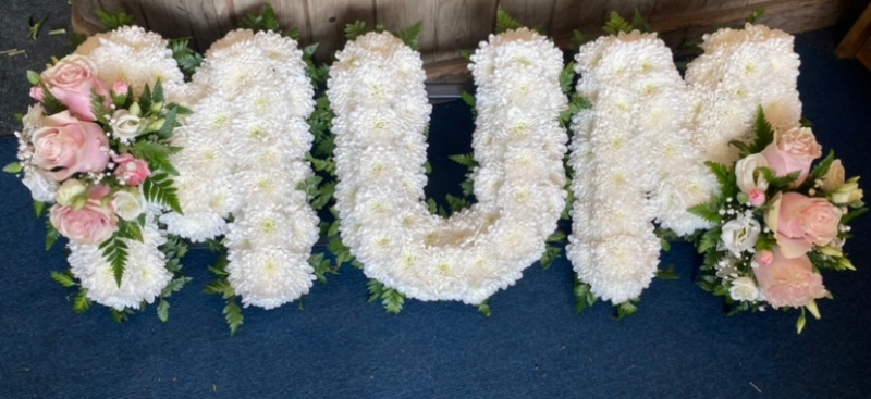 Our letter tributes are based using white chrysanthemums and can be decorated with a foliage edge and a spray of your choice.