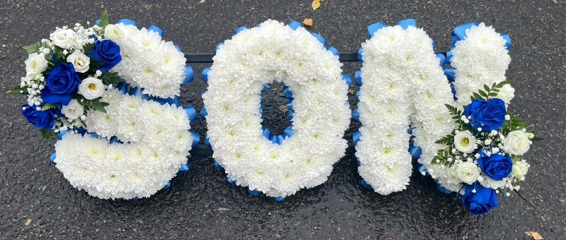 Our letters are based with a beautiful white chrysanthemum and decorated with a spray of your choice.