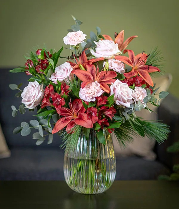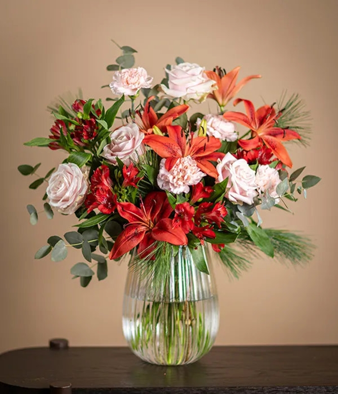 A beautiful hand-tied bouquet including soft pink roses, red alstroemeria, red lilies, pale pink carnations, and seasonal foliage.