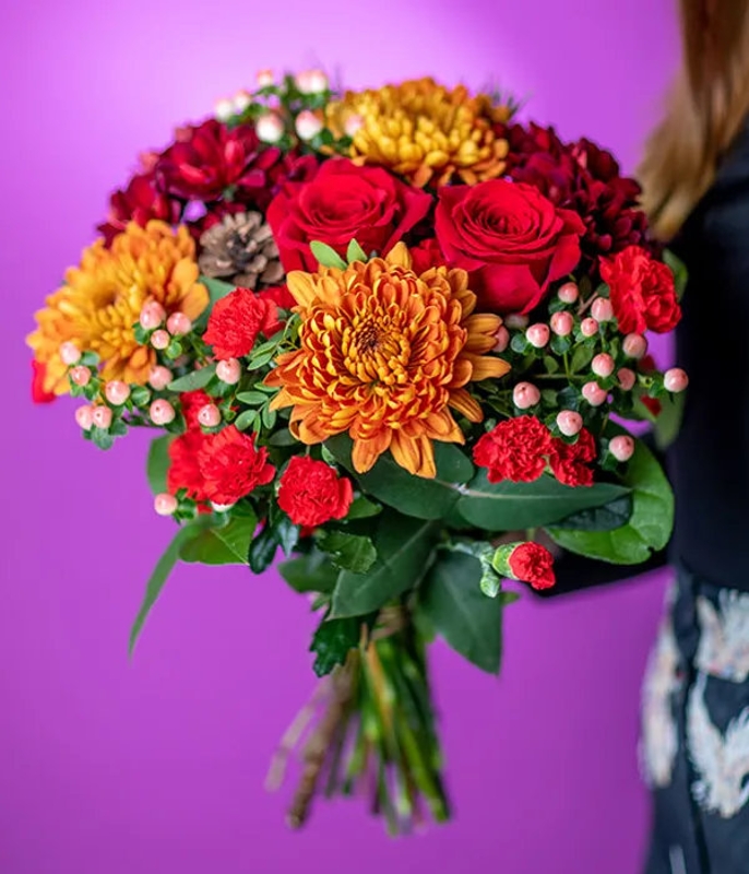 A bright and beautiful festive bouquet! This arrangement is filled with red spray carnations, orange blooms, chrysanthemum, hypericum, pine cones, spruce and seasonal foliage.